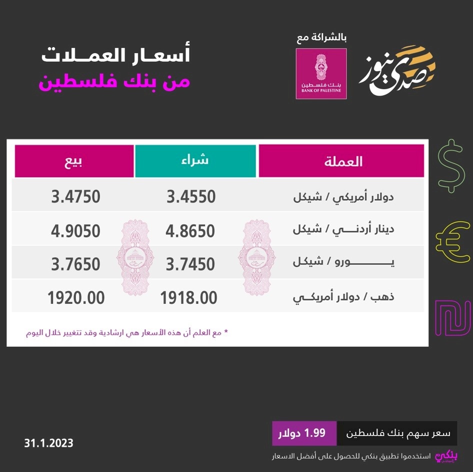 يشار إلى أن سعر صرف الدولار وباقي العملات مقابل الشيكل قابل للتغير خلال ساعات اليوم، وفقاً للتداولات المصرفية في السوق المحلية.