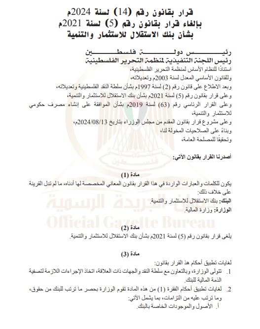 اقتصاد صدى: أصدر الرئيس محمود عباس قراراً بقانون رقم 14 لسنة 2024، بإلغاء قرار بقانون رقم 5 لسنة 2021 بشأن بنك الاستقلال للاستثمار والتنمية.