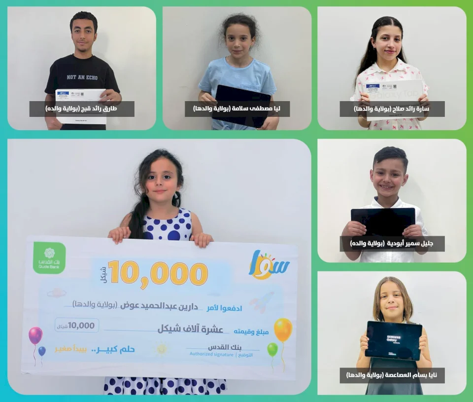 وفي أجواء مفعمة بالبهجة والفخر، سلّم بنك القدس جوائز السحب الثالث للفائزين من فروعه ومكاتبه المنتشرة في محافظات الوطن، حيث حصلت الطفلة دارين عبد الحميد عوض (بولاية والدها) على الجائزة الكبرى بقيمة 10,000 شيكل من مكتب جماعين، فيما فاز كل من: جليل سمير أبودية (بولاية والده) – تابليت – بيت جالا ونايا بسام العصاعصة (بولاية والدها) – تابليت – مكتب سيلة الظهر وليا مصطفى سلامة (بولاية والدها) – تابليت – بديا وطارق رائد قُبَج (بولاية والده) – تابليت – فرع البيرة وسارة رائد صلاح (بولاية والدها) – تابليت – نابلس