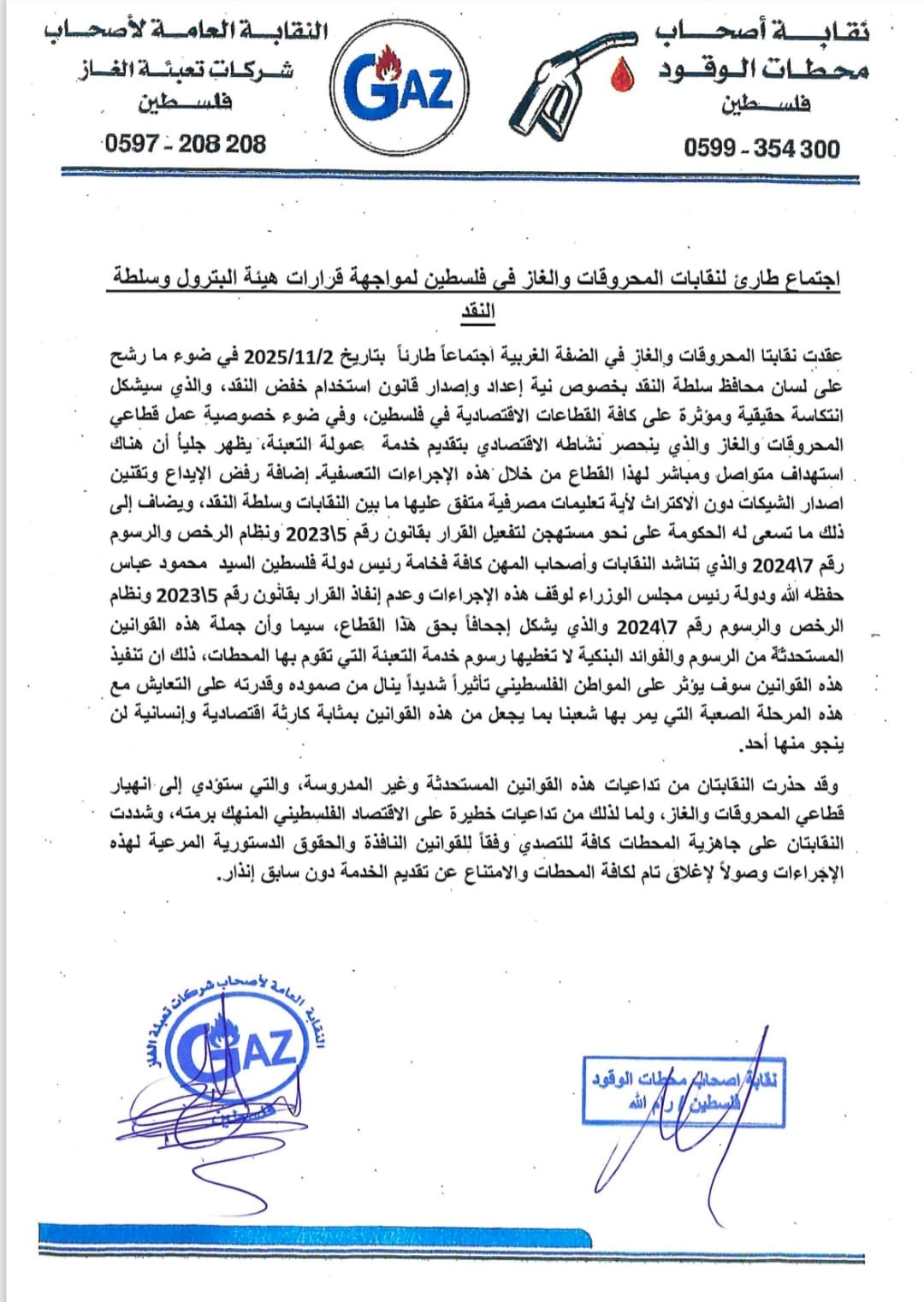 وحذر البيان أن هذه القوانين المستحدثة وغير المدروسة، ستؤدي لانهيار قطاعي المحروقات والغاز، إضافة لتداعيات خطيرة على الاقتصاد الفلسطيني برمته.