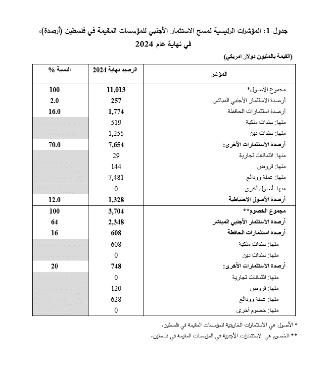 كما بلغ إجمالي رصيد الاستثمارات الأجنبية في المؤسسات المقيمة في فلسطين (الخصوم) حوالي 3,704 مليون دولار أمريكي في نهاية عام 2024 منها 63% استثمار أجنبي مباشر. (انظر/ي جدول1)