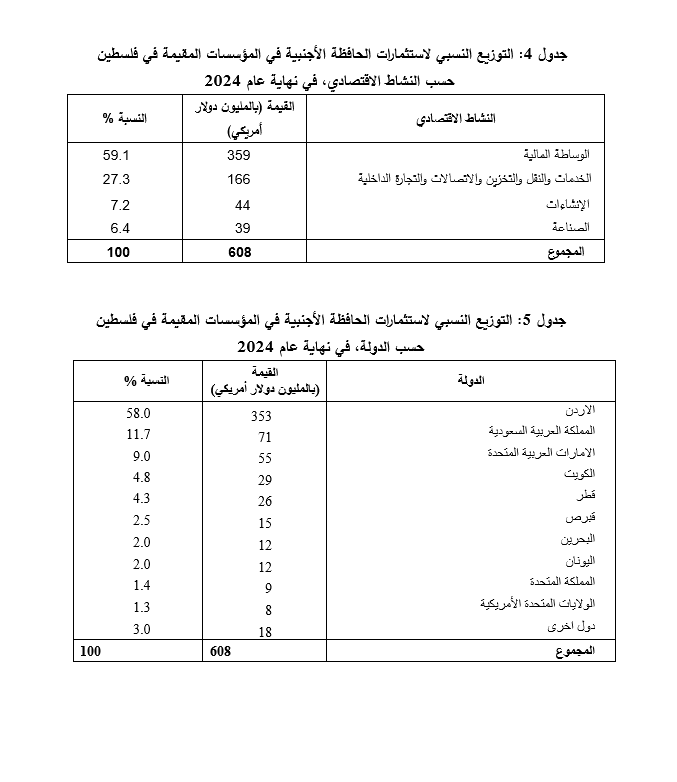 كما أشارت نتائج المسح إلى أن 57% من الاستثمارات الأجنبية المباشرة في المؤسسات المقيمة في فلسطين تتركز في نشاط الوساطة المالية، في حين أن 81% من مجموع الاستثمارات الأجنبية المباشرة في المؤسسات المقيمة في فلسطين وافدة من الأردن.