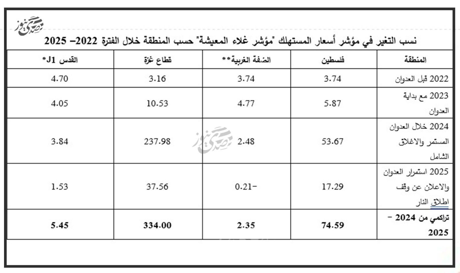 بعد قرابة عامين من الحرب، تظهر البيانات التراكمية لمستويات الأسعار في فلسطين والتي يعدها الجهاز المركزي للإحصاء، واطلعت عليها "صدى نيوز" أن مؤشر غلاء المعيشة شهد تطورات لافتة، انتهت بتسجيل غلاء تراكمي نسبته 74.5% على صعيد فلسطين، وذلك بنسبة 334% في قطاع غزة، وبنسبة 2.35% في الضفة الغربية، وبنسبة 5.45% في القدس. (تراكميا باحتساب عامي 2024 و2025).