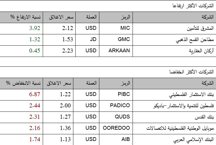 وأغلق مؤشر القدس لجلسة اليوم منخفضاً بمقدار 6.34 نقطة، بنسبة انخفاض بلغت 0.98% عن إغلاق الجلسة السابقة، ليغلق عند مستوى 637.97 نقطة، كما أغلق مؤشر القدس الإسلامي منخفضاً بنسبة 0.49%، وشهدت جلسة اليوم تداول 15 شركة، حيث ارتفعت أسهم 3 شركات، في المقابل انخفضت أسعار أسهم 8 شركات، واستقرت أسعار أسهم 4 شركات أخرى.