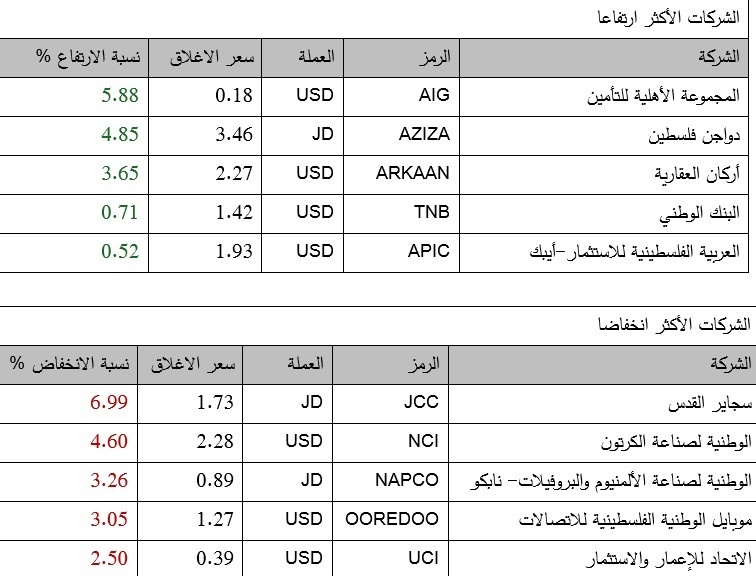 وأغلق مؤشر القدس لجلسة اليوم منخفضاً بمقدار 0.07 نقطة، بنسبة انخفاض بلغت 0.01% عن إغلاق الجلسة السابقة، ليغلق عند مستوى 632.13 نقطة، فيما أغلق مؤشر القدس الإسلامي مرتفعاً بنسبة 0.13%، وشهدت جلسة اليوم تداول 15 شركة، حيث ارتفعت أسهم 6 شركات، في المقابل انخفضت أسعار أسهم 6 شركات، واستقرت أسعار أسهم 3 شركات أخرى.