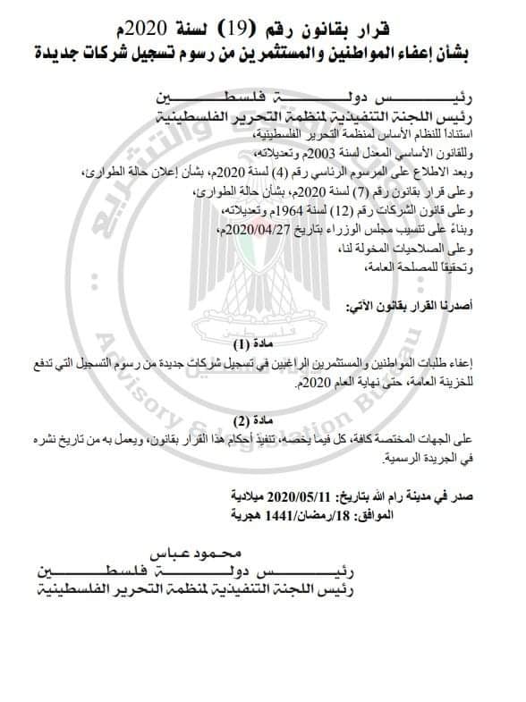 صدى نيوز: اعلن الرئيس الفلسطيني محمود عباس اعفاء طلبات المواطنين والمستثمرين الراغبين في تسجيل شركات جديدة من رسوم التسجيل التي تدفع للخزينة العامة حتى نهاية 2020م.