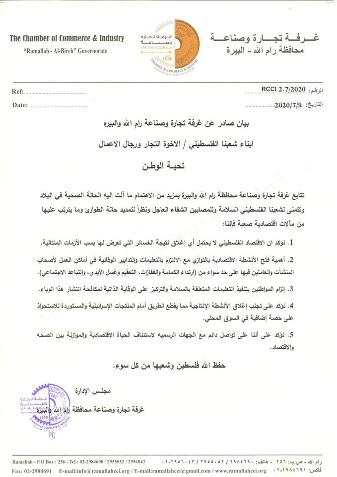 1. نؤكد ان الاقتصاد الفلسطيني لا يحتمل أي إغلاق نتيجة الخسائر التي تعرض لها بسب الأزمات المتتالية.