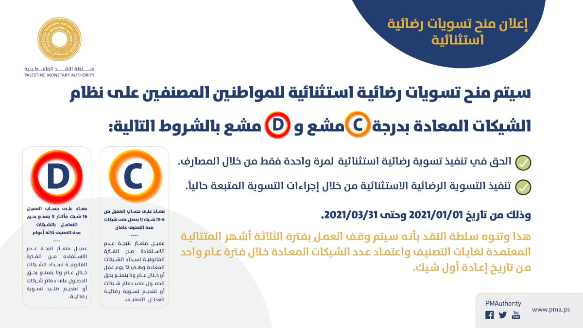 صدى نيوز: أعلن محافظ سلطة النقد السيد عزام الشوا عن السماح للمواطنين المصنفين على النظام C و D مشع على نظام الشيكات المعادة إجراء تسوية رضائية استثنائية للشيكات المعادة على حسابهم وتعديل تصنيفهم حسب الأصول وذلك اعتباراً من تاريخ 01/01/2021 وحتى 31/03/2021، بحيث يتمكن المواطنون المصنفون ولم يستطيعوا سابقاً إجراء تسوية رضائية للشيكات المعادة مراجعة المصرف الذي يتعاملون معه والقيام بتسوية رضائية استثنائية لتعديل تصنيفهم وذلك لمرة واحدة فقط، على أن يتم بعد هذا التاريخ وقف استلام طلبات الاسترحام لإجراء تسوية رضائية استثنائية.