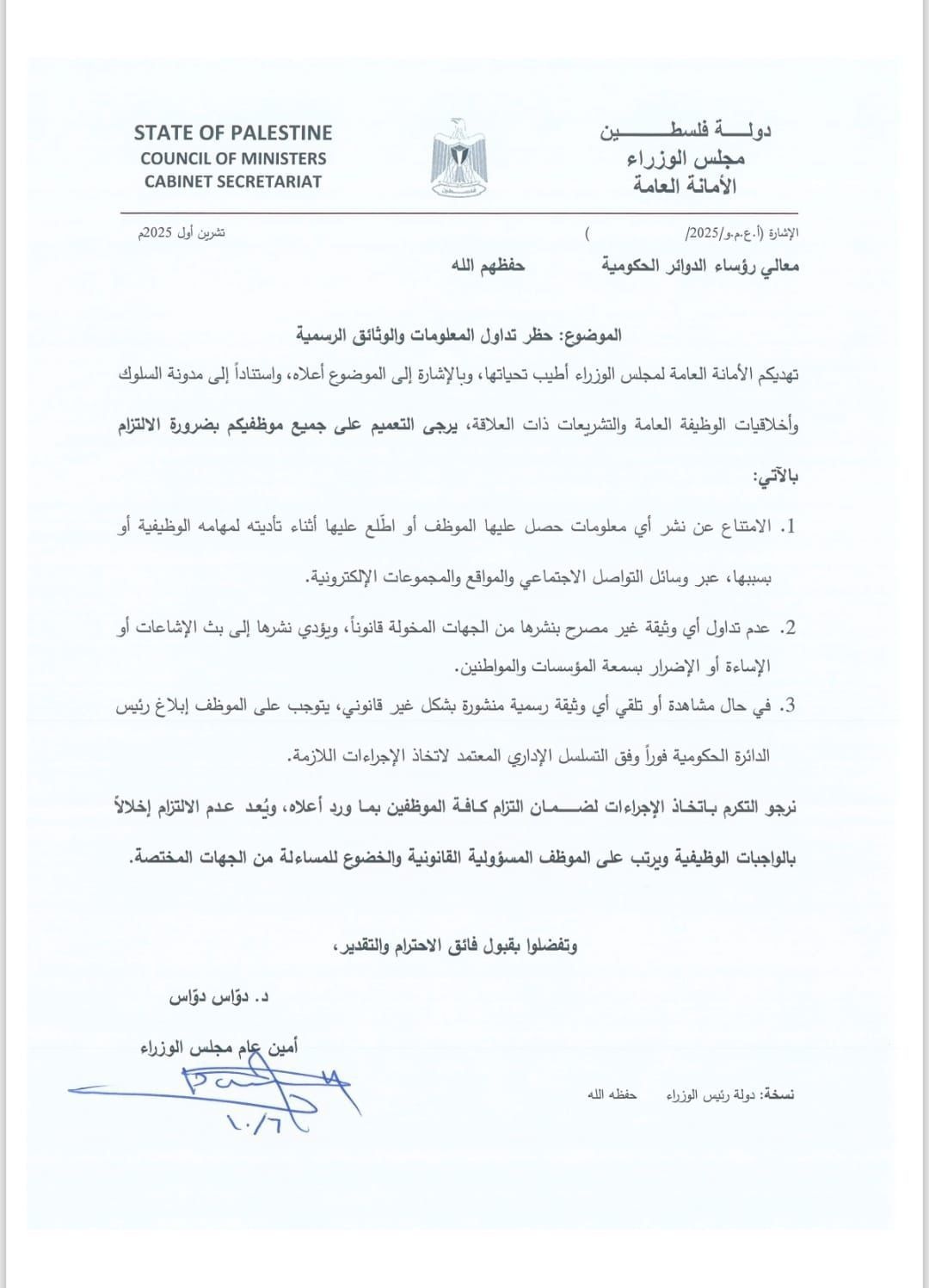 Special to SadaNews: The debate in the Palestinian street has intensified following the leak of an official book issued by the Secretary-General of the Palestinian Cabinet, which prohibits the circulation of government documents and information. Ironically, this book, which was intended to prevent leaks, itself became one of the most notable leaks, turning into a topic of public discussion and igniting waves of questions about the limits of transparency and the citizens' right to know.