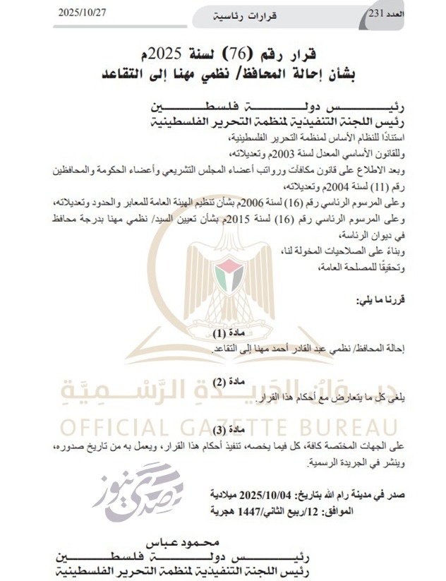 SadaNews: A decision was issued by President Mahmoud Abbas on October 4, 2025, regarding the retirement of Governor Nazmi Mahna, the former Director-General of the Palestinian Crossings and Borders Authority. This decision was published that day in the official gazette, as SadaNews reported.