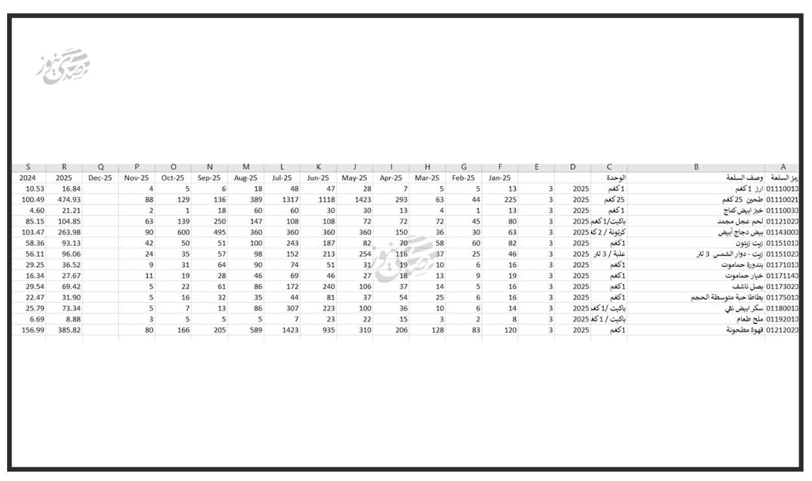 The price of 25 kg of flour has witnessed the highest increase during the year, reaching 474.93 shekels compared to 100.49 shekels in 2024, marking an increase of 372%.