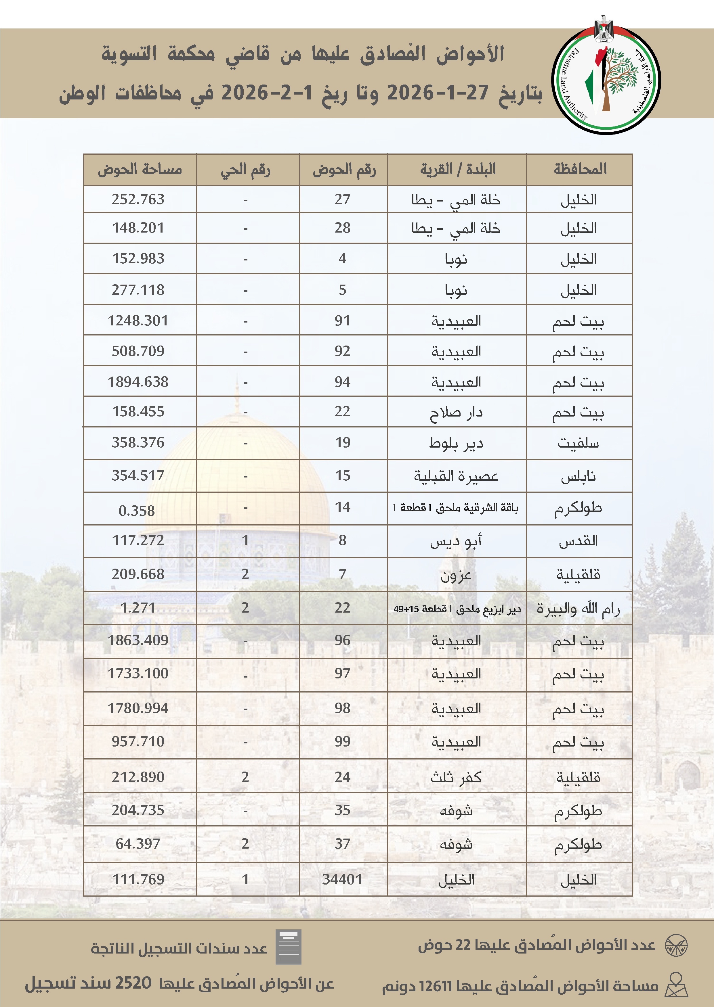 SadaNews - The Palestinian Land Authority announced a new significant achievement within the land settlement project, represented by the approval of 22 settlement basins by the settlement judge, with a total area of 12,611 dunams. This resulted in the issuance of 2,520 registration deeds after completing the approved legal procedures.