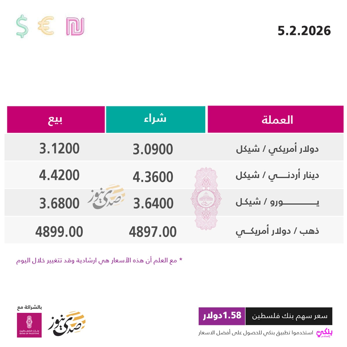 SadaNews - The currency exchange rates against the shekel today, Thursday (February 5), are as follows: