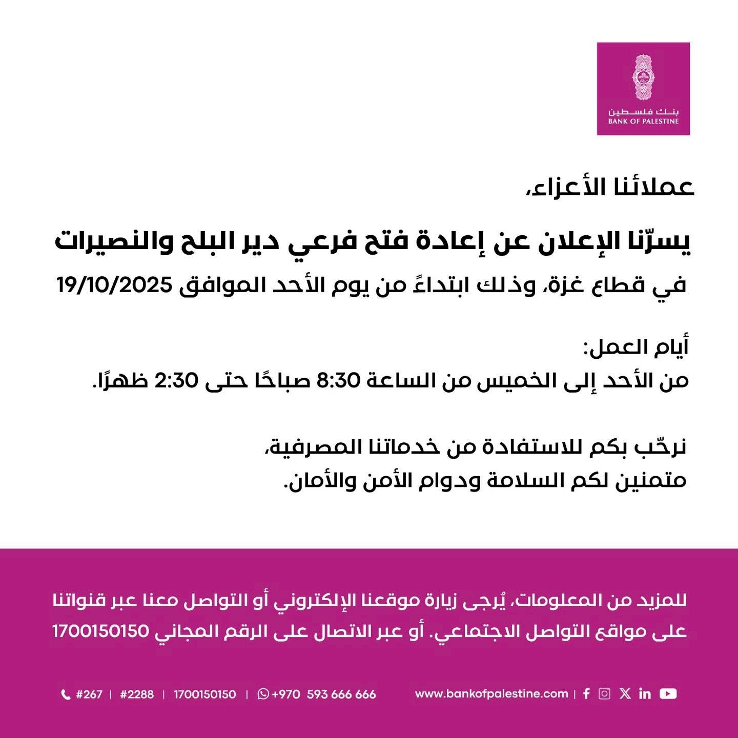 La banque a précisé qu'il avait été décidé d'ouvrir les succursales de Deir al-Balah et de Nuseirat dans la bande de Gaza à partir de demain, dimanche, pour bénéficier des services bancaires.