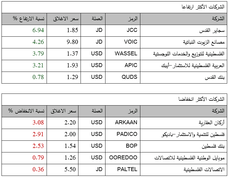 בישיבת היום חוו המסחר ערך של 396,457 דולר, בעוד שסך הכל המניות traded היה 294,596 מניות, והשוק היום ראה 70 עסקאות, כאשר הנזילות במסחר של היום הייתה 58% המפוזרת על מניות בנק ירושלים ואחר כך על ערבית פלסטינית להשקעה - אייפק 33%, 26% בהתאמה.