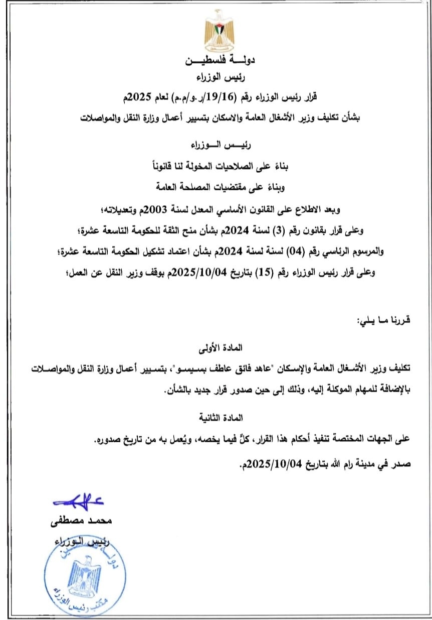 סאדה ניוז - ראש הממשלה הפלסטיני מוחמד מוסתפה החליט ביום שבת להטיל על שר עבודות הציבור והדיור, עאייד בסיסו, לנהל את עסקי משרד התחבורה והתחבורה של טארק זערב.