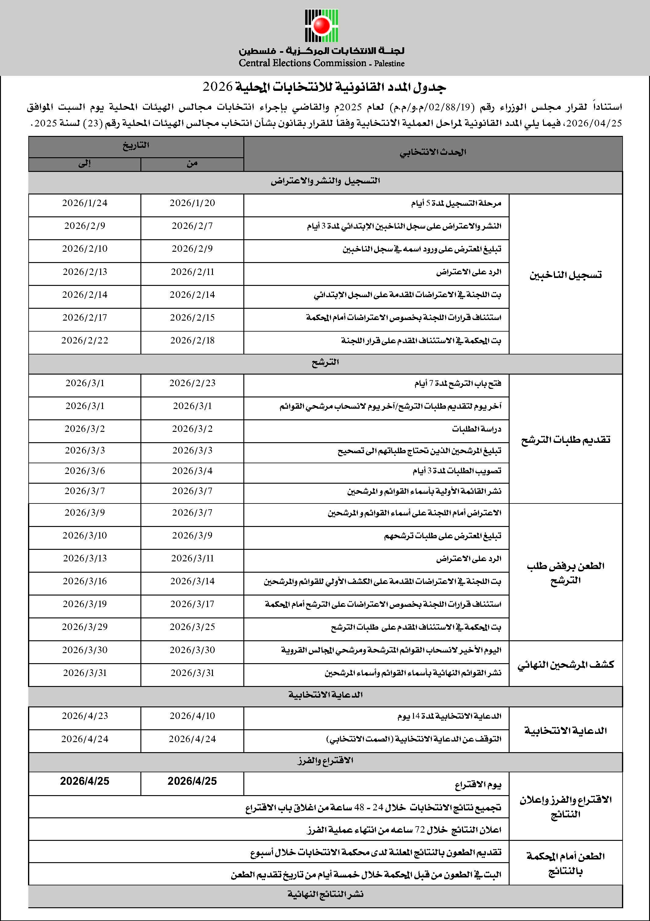 בהתבסס על החוק לבחירות למועצות המקומיות מספר (23) לשנת 2025, הסבירה הוועדה לבחירות כי שלב הרישום יארך מה-20 ועד ה-24 בינואר 2026, ואחריו יתקיים שלב פרסום ההתנגדויות בתקופה מה-7 ועד ה-9 בפברואר הקרוב. פתיחת ההרשמות תימשך 7 ימים מהבוקר של ה-23/2/2026 ועד ערב ה-1/3/2026, ותפורסם רשימת המועמדים הסופית ביום ה-31/3/2026.