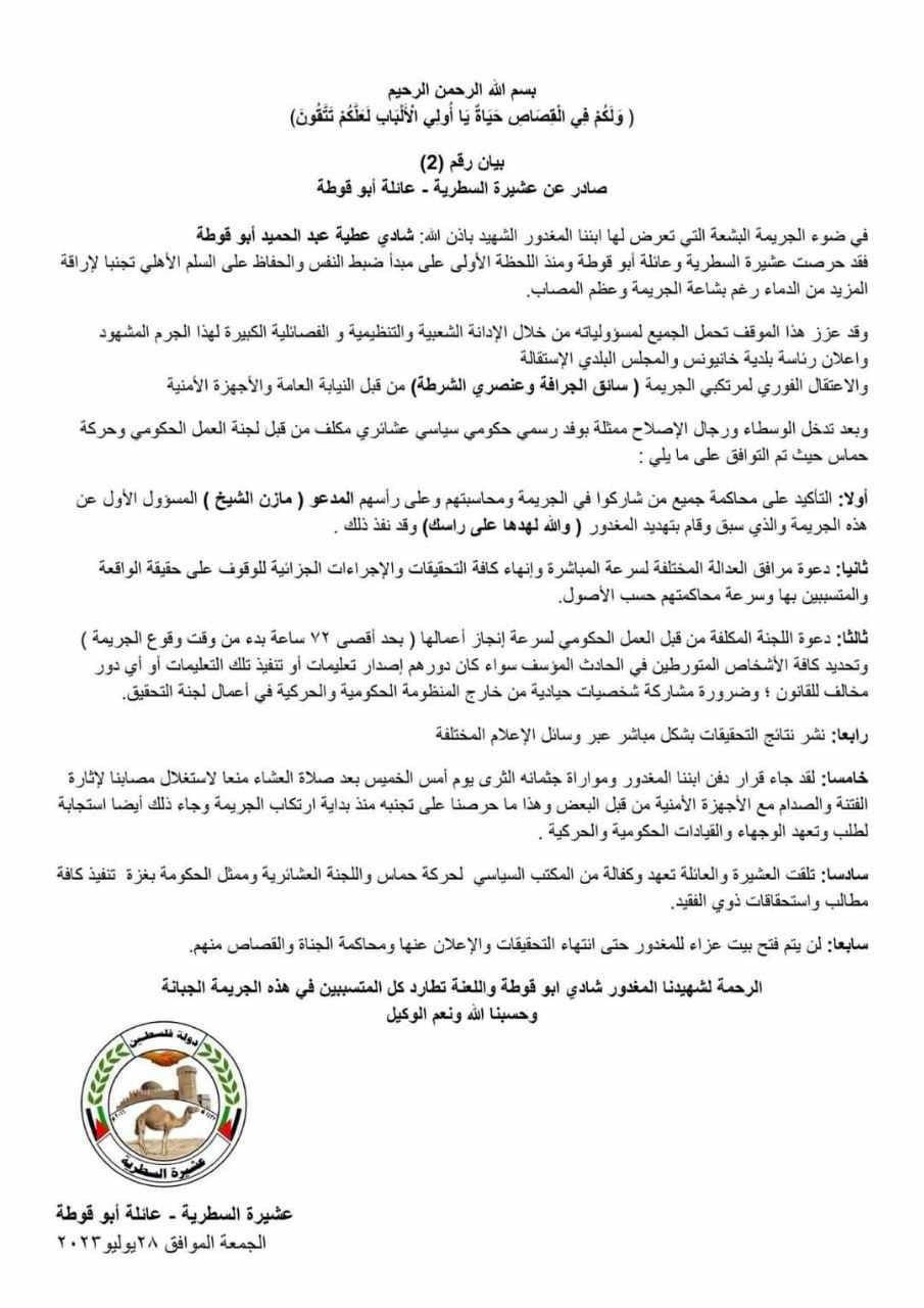 وأشار البيان، إلى أن عائلة أبو قوطة، وعشيرة السطري، حصلتا على تعهد وكفالة من المكتب السياسي لحركة حماس واللجنة العشائرية وممثل الحكومة بغزة تنفيذ كافة مطالب واستحقاقات ذوي الفقيد.