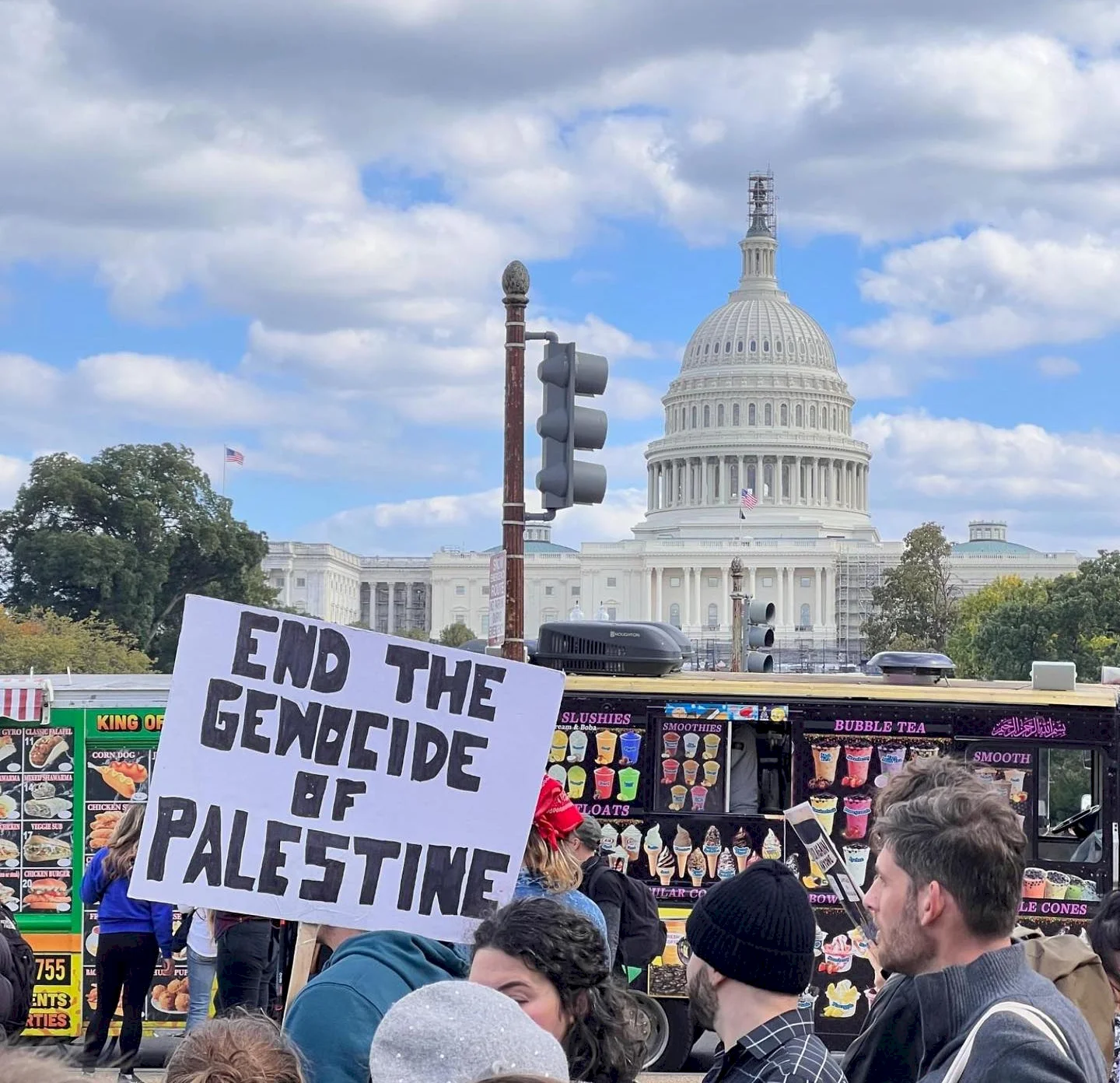 وتجمع المتظاهرون خارج مبنى الكابيتول الأمريكي، رافعين لافتة كتب عليها "لا للإبادة الجماعية في غزة!".