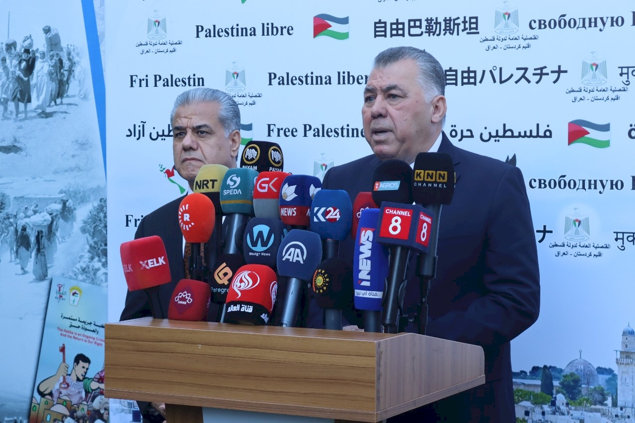 خلال مؤتمر صحفي مشترك مع السفير حزوري، على هامش زيارة وفد رئاسة إقليم كوردستان للقنصلية الفلسطينية في أربيل، بمناسبة اليوم الدولي للتضامن مع الشعب الفلسطيني وذكرى افتتاحها.