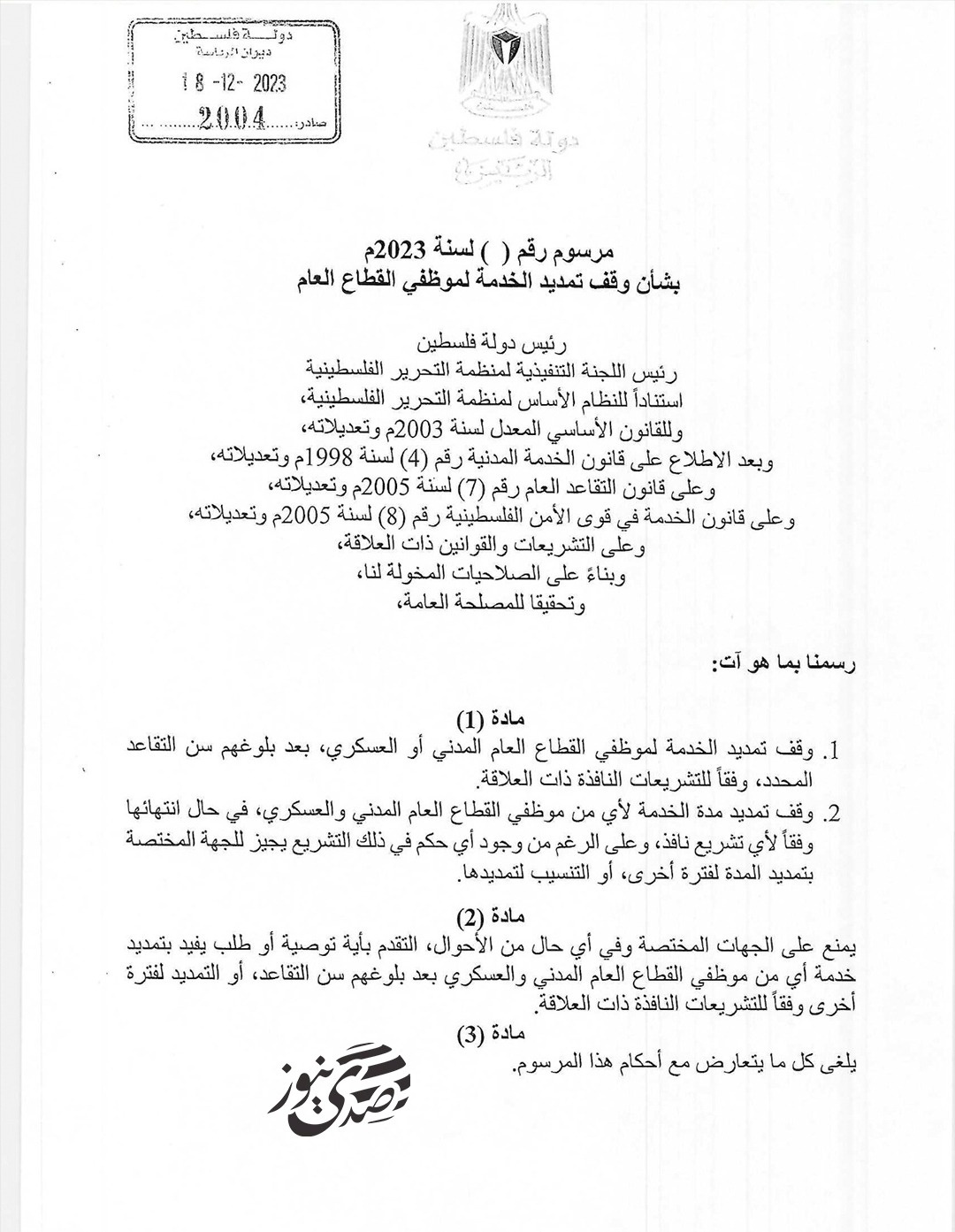 صدى نيوز - أصدر الرئيس محمود عباس مرسوماً رئاسياً بشأن وقف تمديد الخدمة لموظفي القطاع العام المدني أو العسكري، بعد بلوغهم سن التقاعد المحدد.