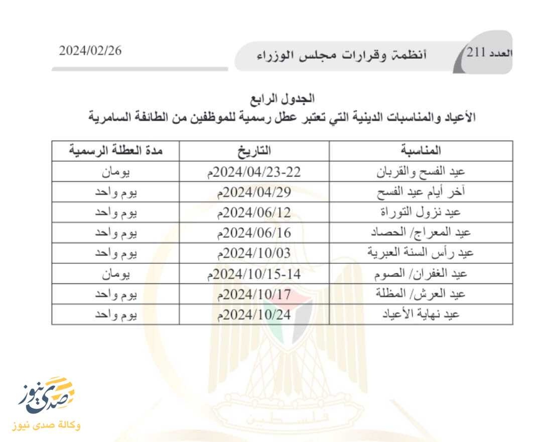 صدى نيوز - طالع العطل الرسمية للأعياد والمناسبات الوطنية في فلسطين خلال عام 2024، وفق ما أقر مجلس الوزراء الفلسطيني: