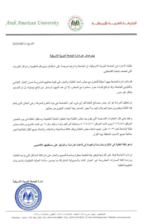 إلى ذلك أصدر مجلس الطلبة في الجامعة العربية الأمريكية بيانا وصل صدى نيوز ردا على قرار الجامعة بتجميد المجلس ووقف أنشطته.