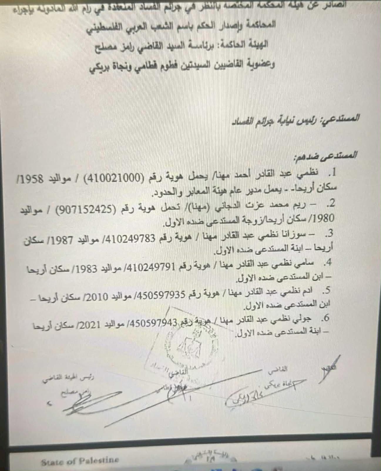 القضية التي كانت قد أُثيرت قبل فترة ونفاها مهنا علناً، عادت إلى الواجهة بعد أن أثبتت التحقيقات وجود شبهات جدية، دفعت المحكمة إلى إصدار قرار باستدعائه إلى جانب 15 شخصاً آخرين، بينهم زوجته، وسبعة من أولاده وبناته، من بينهم ابنه سامي مهنا، سفير فلسطين في ألبانيا، بالإضافة إلى أخيه، ومرافقه، وأربعة موظفين من قسم المحاسبة على المعابر، ورجل أعمال.