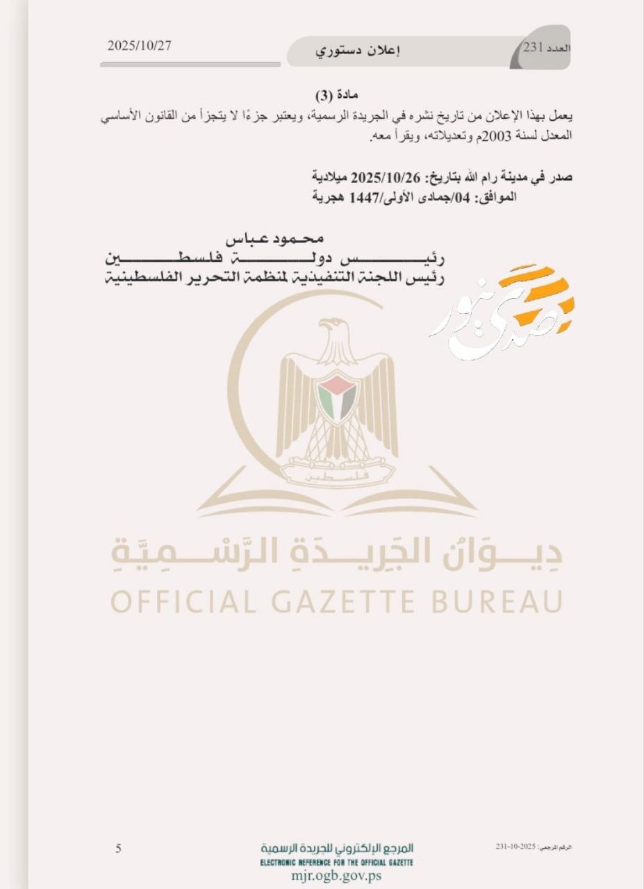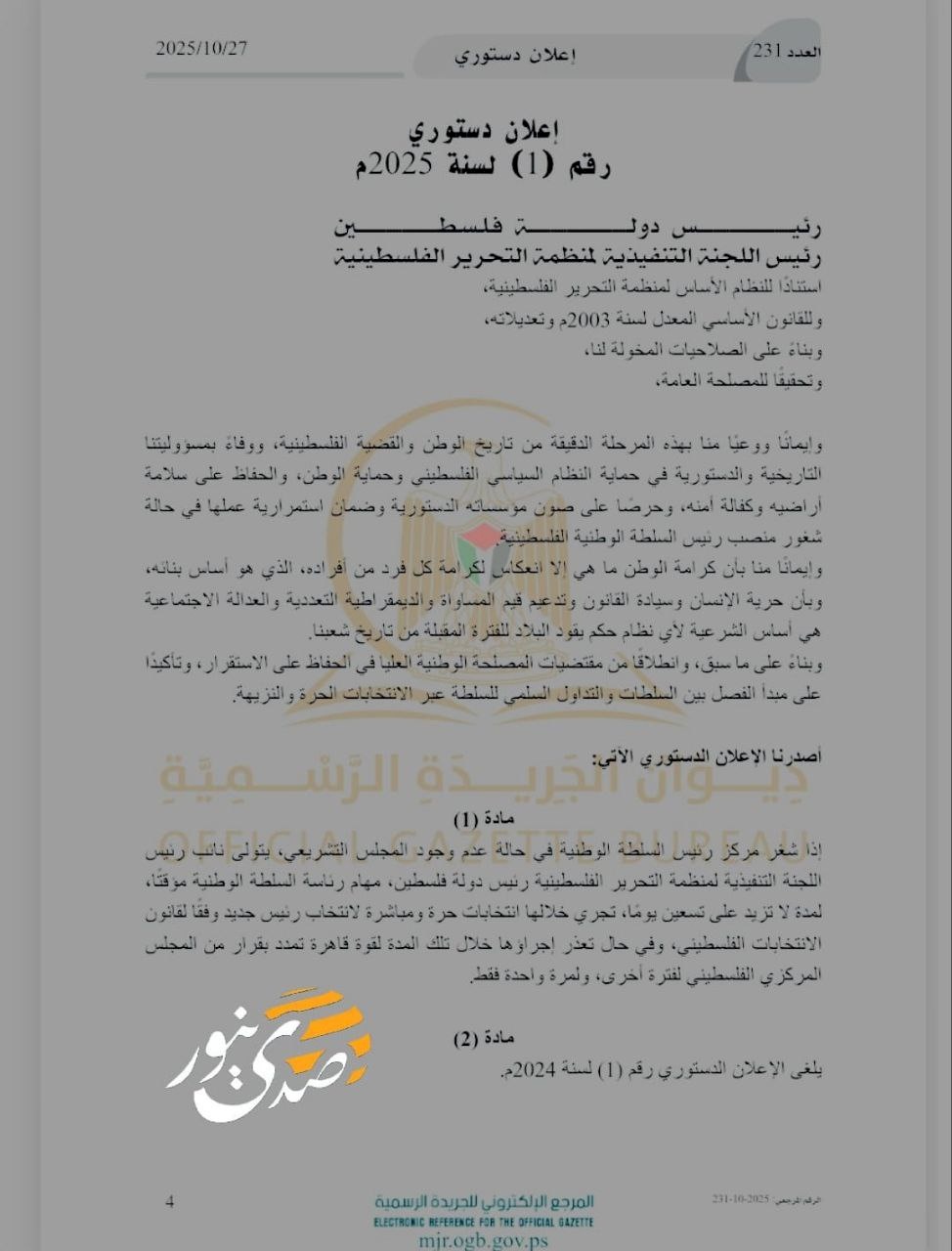 وبموجب الإعلان الدستوري الجديد، يلغى الإعلان الدستوري رقم (1) لسنة 2024، حفاظاً على المصلحة الوطنية لشعبنا الفلسطيني.