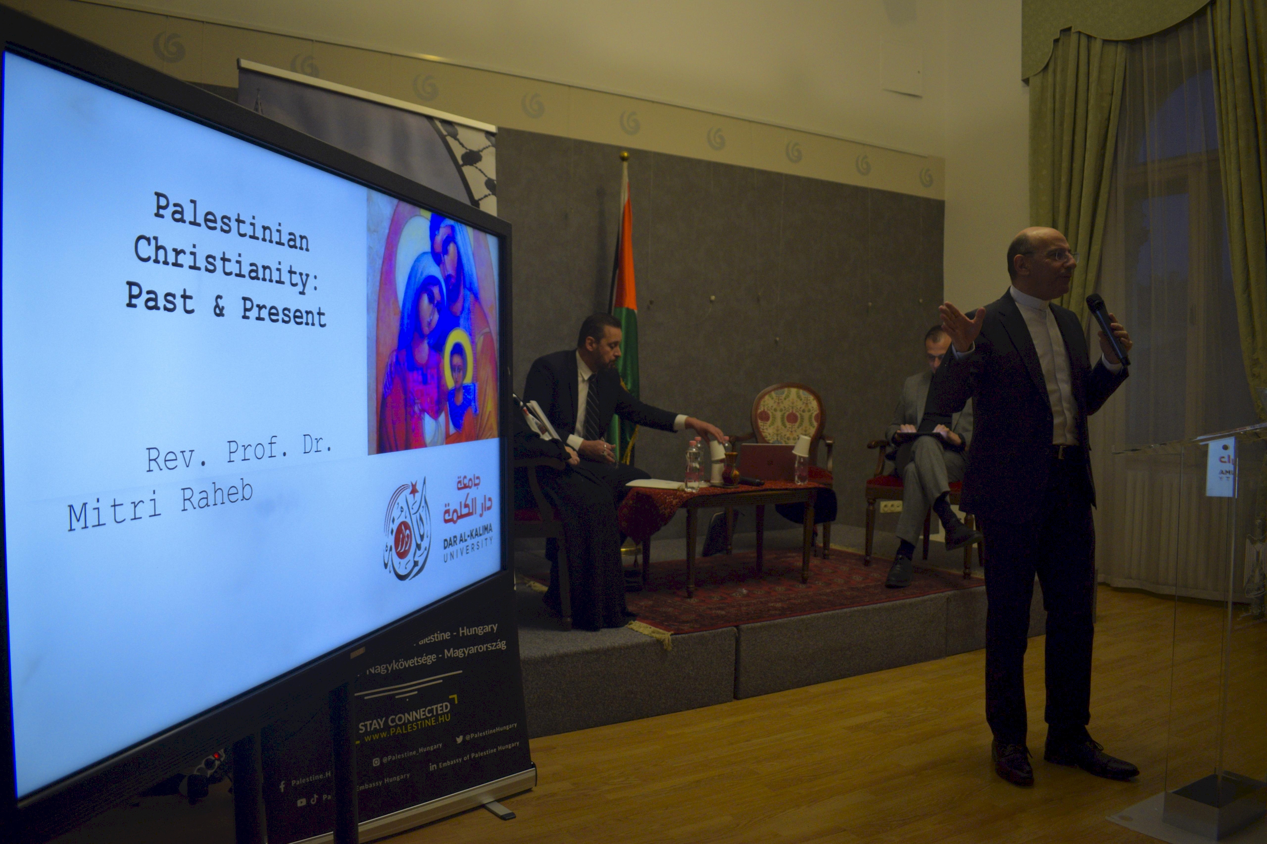 صدى نيوز - نظمت سفارة دولة فلسطين لدى المجر، في المركز الثقافي التركي يونس أمري، ندوة حول واقع المسيحيين في فلسطين، بمشاركة القسيس بروفيسور متري الراهب، والقسيس د. منذر إسحق، والأم أغابيا، وبمداخلة عبر الزوم للسفيرة أميرة حنانيا، وبحضور سياسي وبرلماني ومجتمعي ودبلوماسي واسع.