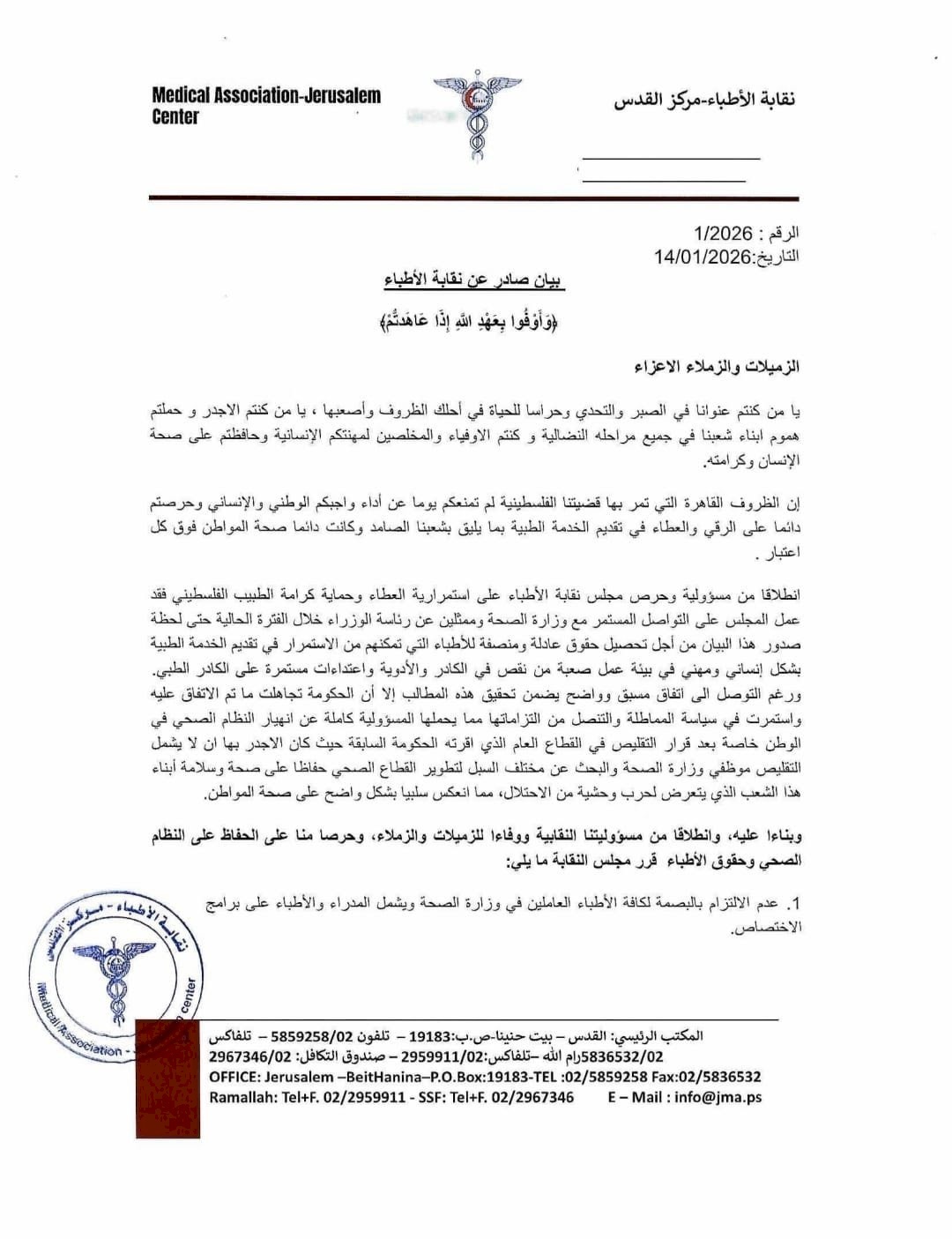 وأوضح البيان أن الحكومة تجاهلت الاتفاقات السابقة التي تم التوصل إليها مع النقابة، واستمرت في سياسة المماطلة والتنصل من التزاماتها، الأمر الذي يحمّلها المسؤولية الكاملة عن تدهور النظام الصحي في البلاد. وأشار إلى أن قرار التقليص في القطاع العام الذي أقرته الحكومة السابقة انعكس بشكل سلبي على صحة المواطنين، وكان الأجدر بالحكومة أن تستثني موظفي وزارة الصحة وأن تبحث عن حلول لتطوير القطاع الصحي في ظل الظروف القاسية التي يواجهها الشعب الفلسطيني.