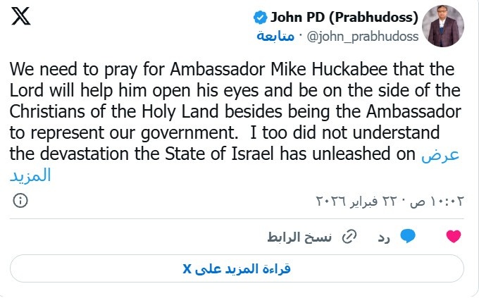 كما برزت أصوات مسيحية أمريكية تنتقد موقف السفير، إذ كتب أحدهم: "علينا أن نصلي من أجل السفير مايك هاكابي، أن يوفقه الله ويفتح عينيه ليقف إلى جانب مسيحيي الأرض المقدسة، إلى جانب كونه سفيرا يمثل حكومتنا. لم أكن أدرك حجم الدمار الذي ألحقته دولة إسرائيل بمسيحيي الأرض المقدسة طوال أكثر من 70 عاما، حتى سنحت لي فرصة لقائهم والتعرف عليهم شخصيا في القدس والناصرة والجليل".