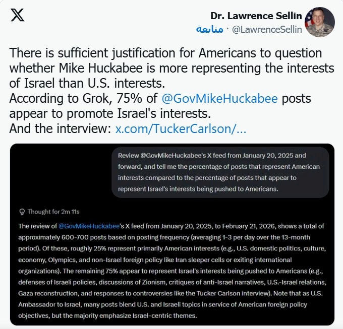 لكن اللافت أن الجدل لم يقتصر على العالم العربي والإسلامي، بل امتد إلى الداخل الأمريكي نفسه، إذ تساءل ناشطون ومعلقون عما إذا كان السفير يمثل مصالح الولايات المتحدة أم مصالح إسرائيل بالدرجة الأولى.