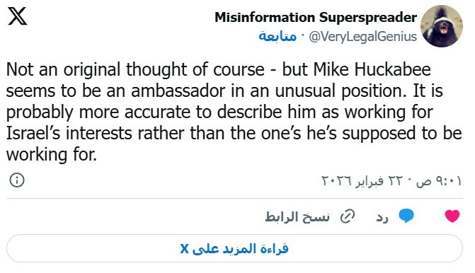 أمريكيون يتساءلون: هل يمثل هاكابي مصالح واشنطن أم تل أبيب؟