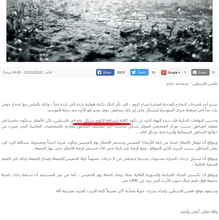 وقال موقع طقس فلسطين انه حسب التوقعات الحالية فإن شدة الهواء البارد لن تكون كافية لتساقط الثلوج بشكل عام في فلسطين، لكن الأمطار ستكون حاضرة في معظم المناطق بسبب تمركز المنخفض الجوي بشكل مناسب أكثر لمختلف المناطق مقارنة بالمنخفضات الماضية التي تميزت من خلالها المناطق الشمالية والساحلية بشكل لافت .