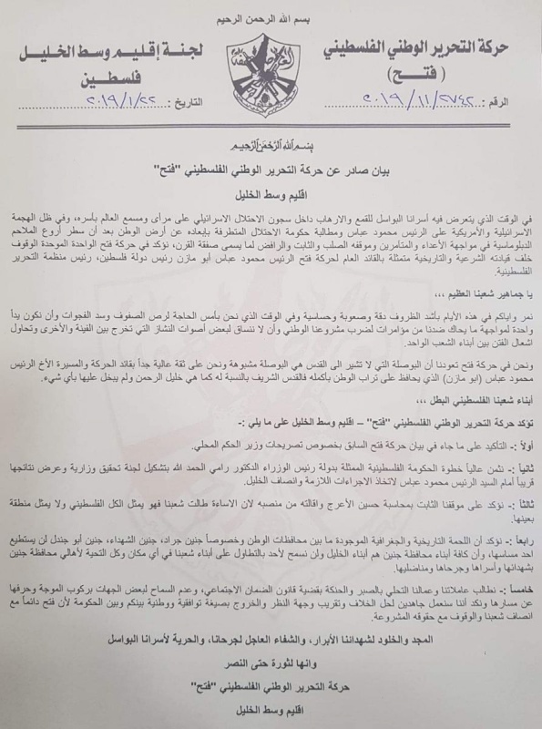 بيان لحركة فتح بالخليل بخصوص الوزير الأعرج