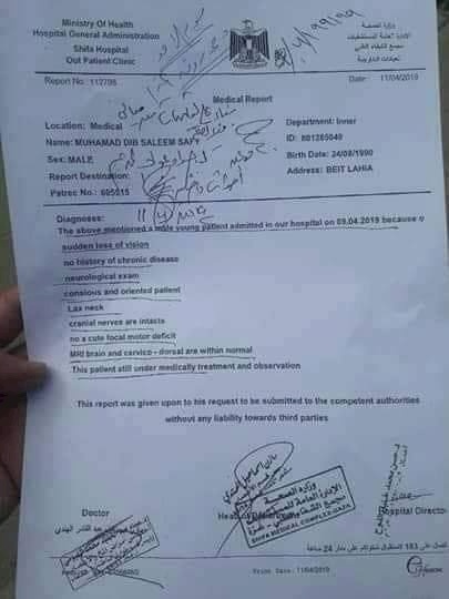 محمد المكلوم في بصره موجود حاليًا في مستشفى الشفاء في غزة، أكد أن جهاز الأمن الداخلي قام باعتقاله بتاريخ 19/03/2019، على الرغم من أنه كان على موعد لإجراء عملية جراحية في عينه اليمنى في اليوم التالي.