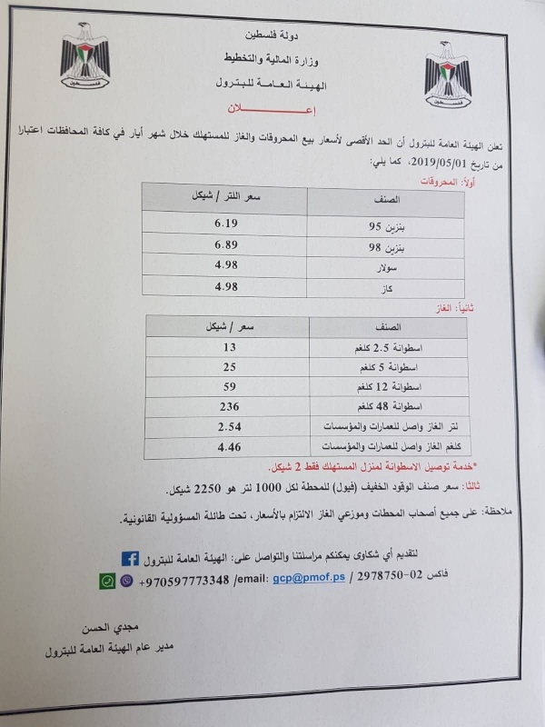 رام الله - صدى نيوز - أعلنت الإدارة العامة للبترول في وزارة المالية، أسعار المحروقات والغاز للمستهلك لشهر أيار في كافة محافظات الوطن .