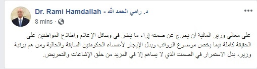 وقال الحمد الله في منشوره على صفحته الرسمية فيسبوك ان استمرار صمت الوزير بشارة يساهم في المزيد من خلق الاشاعات والتحريض " على حد تعبيره".
