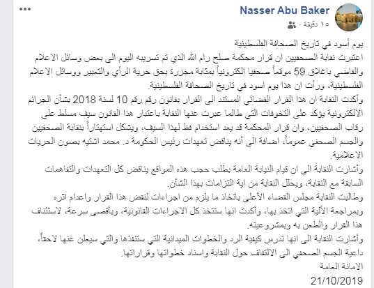 وكتب نقيب الصحفين ناصر ابو بكر " هذا يوم اسود في تاريخ الصحافة الفلسطينية"