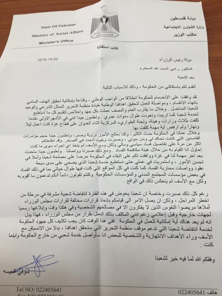 رام الله- صدى نيوز- نشر وزير الشؤون الاجتماعية سابقاً شوقي العيسة، اليوم على صفحته في "فيسبوك" صورة عن كتاب استقالته من الوزارة بتاريخ (20/10/2015)، يوضح فيها سبب الاستقالة.