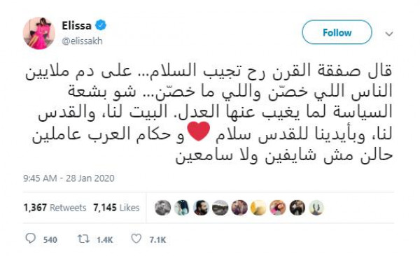 وكتبت إليسا عبر حسابها بموقع (تويتر) باللهجة اللبنانية: "قال صفقة القرن رح تجيب السلام.. على دم ملايين الناس اللي خصّن واللي ما خصّن.. شو بشعة السياسة لما يغيب عنها العدل".
