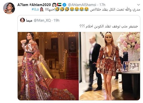 نشر رواد مواقع التواصل الاجتماعي صورة للنجمة الأمريكية جينيفر لوبيز إلى جانب الفنانة الاماراتية أحلام، حيث ظهرتا بنفس قماش الفستان مع اختلاف التصميم وكتبوا معلقين: "جينيفر متى توقف تقلد الكوين احلام؟؟؟".