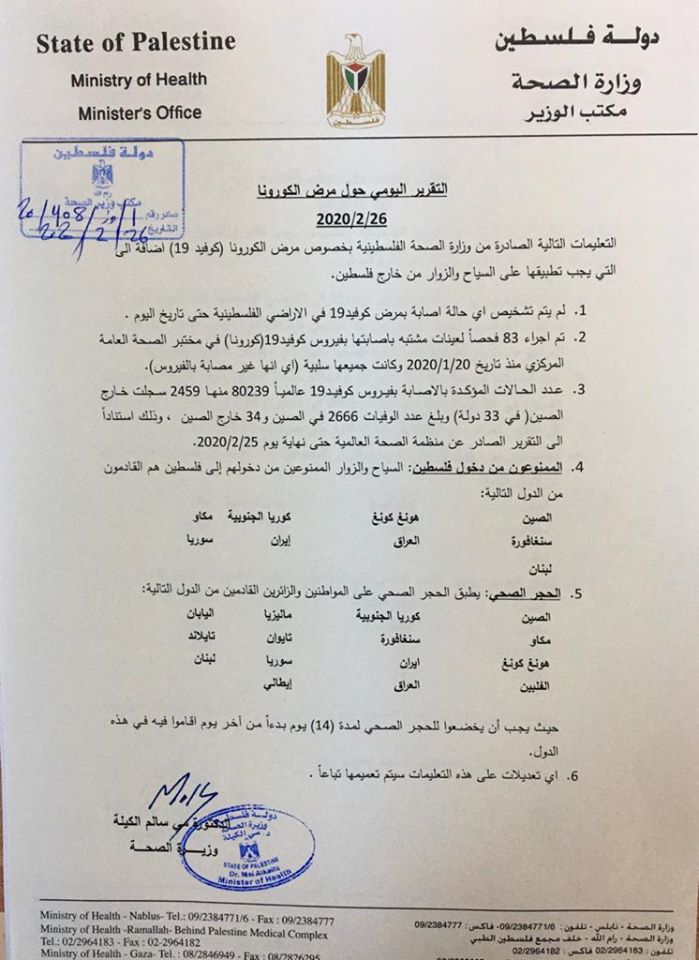 صدى نيوز: افادت دائرة الطب الوقائي في وزارة الصحة الفلسطينية، أنه تم منع دخول سياح من 9 دول آسيوية إلى فلسطين، بسبب تفشي فيروس (كورونا) فيها.