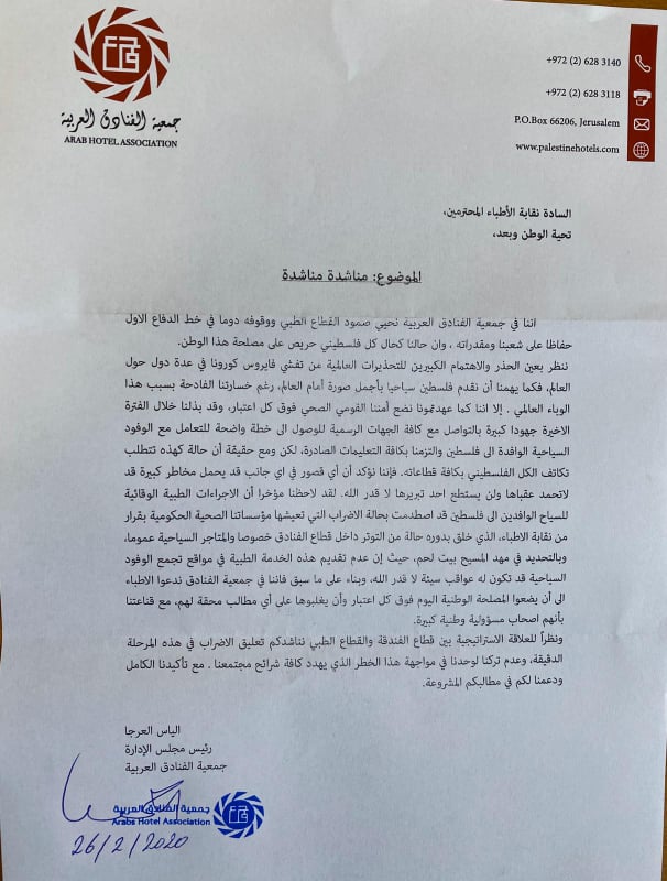 جمعية الفنادق الفلسطينية تناشد نقابة الأطباء بتعليق الاضراب