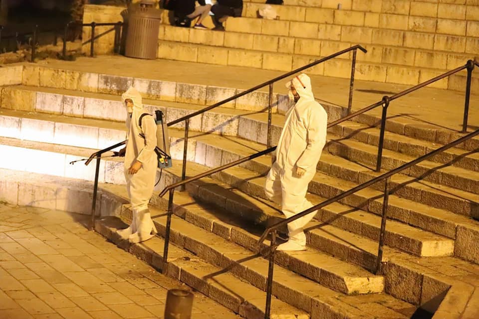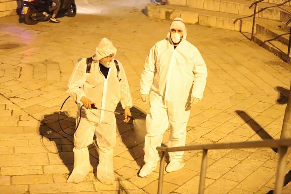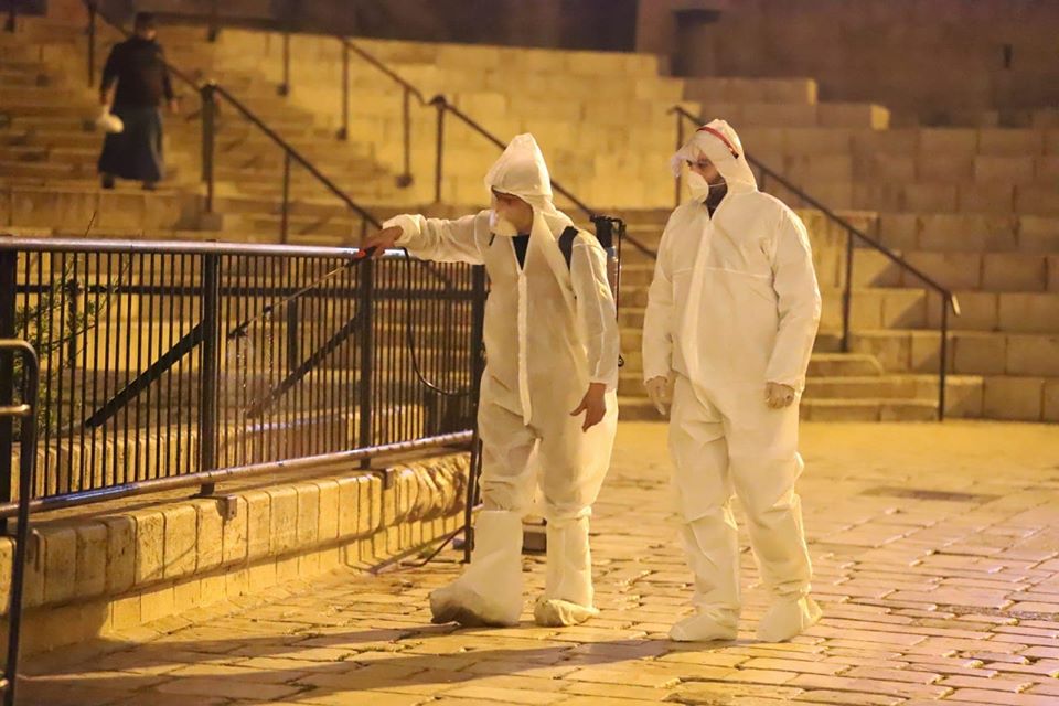 صور: متطوعون يشرعون بتعقيم الأماكن العامة في البلدة القديمة بالقدس