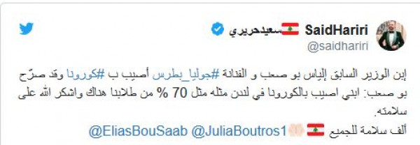 من جهته قال زوج الفنانة جوليا بطرس، البرلماني إلياس بو صعب: "أصيب ابني بفيروس كورونا في لندن مثله مثل 70% من المصابين هناك".