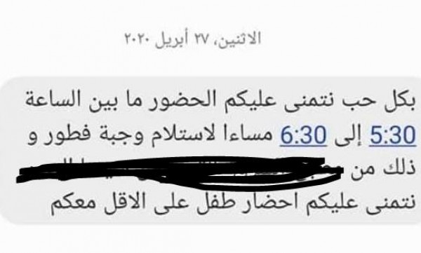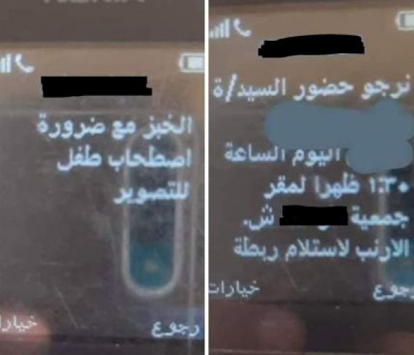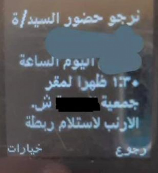 وتداول النشطاء، صورة قالوا إنها رسالة صادرة عن الجمعية، وموجهة إلى أحد المنتفعين وجاء فيها: نرجو حضور السيد/ة اليوم الساعة الواحدة والنصف ظهرًا، لمقر الجمعية، لاستلام ربطة الخبز مع ضرورة اصطحاب طفل للتصوير.