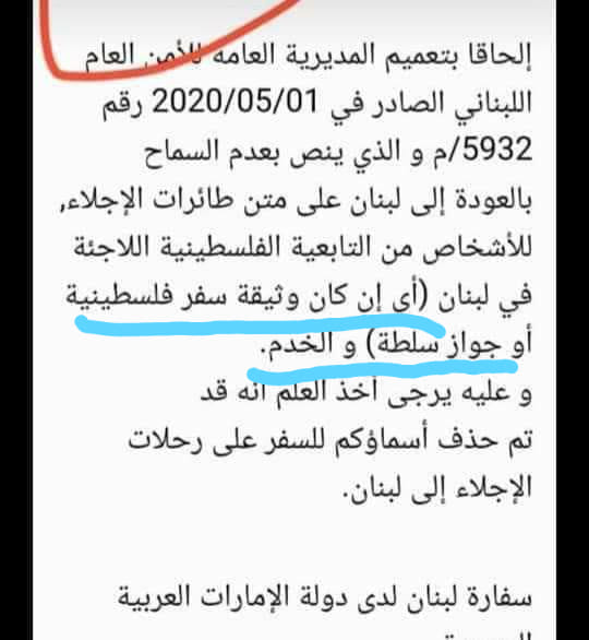 صدى نيوز: أصدرت المُديرية العامة للأمن العام اللبناني تعميماً إلى طيران الشرق الأوسط (الرقم 5932/م) يقضي بعدم السماح للأشخاص من التابعية الفلسطينية اللاجئة في لبنان (أي إن كان اللاجئ يحمل وثيقة سفر فلسطينية أو جواز سلطة) بالعودة إلى لبنان على متن طائرات الإجلاء.