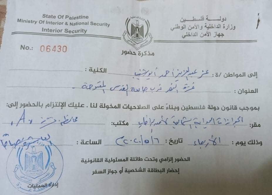 وقال ابو شنب في افادة الى نقابة الصحفيين انه فوجئ بتلقى استدعاء من جهاز امن حماس الداخلي ويطالبه بضرورة الحضور الى مقر الجهاز بمدينة غزة اليوم الاربعاء.